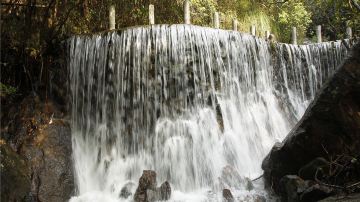 这是一座月牙形的水坝,它坐落在绿水青山之间,水流从水坝上倾泻而下,形成一帘小型瀑布,宛如一条丝带缠绕在山间,吸引众多游客前往参观。