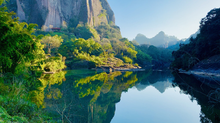 九曲溪竹筏漂流一般是从九曲到一曲顺流而下,这样随波逐流,更加轻快、迅疾。游九曲,所乘之舟为8-9根去皮毛竹烤后扎成。吃水浅、浮力大,游人乘坐安稳舒适,视野开阔,可见山景,能赏水色,九曲溪漂流而下既轻松惬意,又有惊无险。