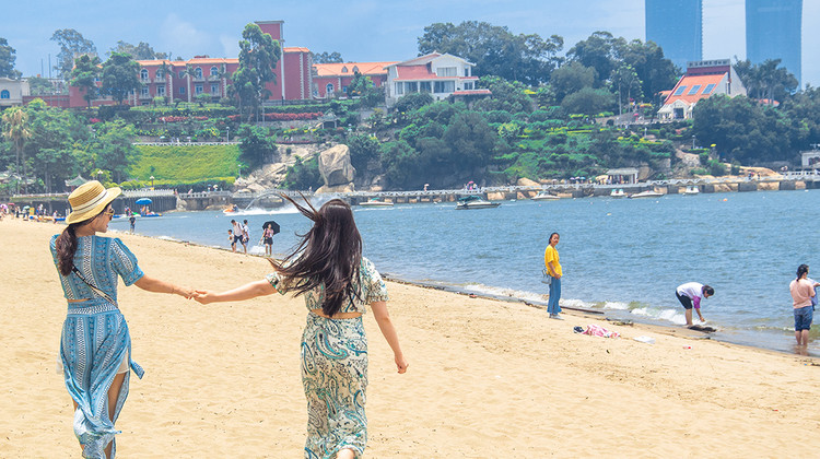 港仔后沙滩位于菽庄花园西面,两者毗连在一起。港仔后的海面又名金带水。站在沙滩上,面朝大海,背面就是日光岩,可以看到高处光秃秃的岩石,所以这里风景还是很美的。这里又是一个人群聚集区,很多人是来游玩菽庄花园的,正巧这里有个浴场,便下来用海水泡泡脚也不错。