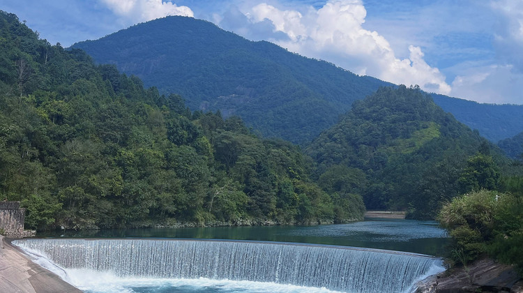 这是一座月牙形的水坝,它坐落在绿水青山之间,水流从水坝上倾泻而下,形成一帘小型瀑布,宛如一条丝带缠绕在山间,吸引众多游客前往参观。