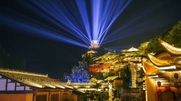 夜幕低垂,华灯初上,浪漫的气息笼罩着整个山谷,隐世悬崖之上的灯火阑珊,山林溪水相伴,享受仙谷夜色。
