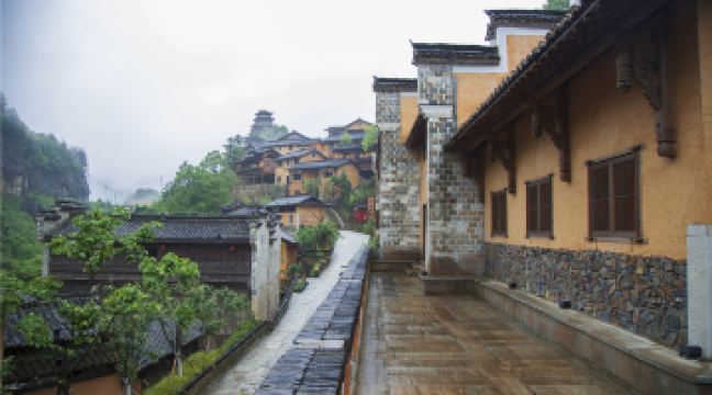 到达望仙谷➠瀑布栈道➠ 白鹤崖观景台➠揽月桥➠百味街➠胡氏宗祠➠杨府广场➠百舸桥➠鸣蝉巷➠作坊街➠福家小院观景台➠朝鹤楼➠玻璃栈道➠雷木桥(白鹤崖Z字造型)