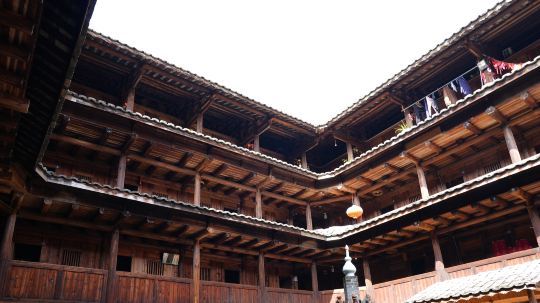 整个景区壮观的应该是5层楼高的和贵楼,它是较大的方形土楼,令人诧异的是它是建在沼泽地之上的。中庭有一块下陷的鹅卵石地面,长期潮湿,人站在上面踩一踩就能感觉到地面的上下摇动。需要注意的是,如果你想要上楼,需要另外支付5元,并且这里的商业气息很浓重,各种小摊挤的满满当当。
