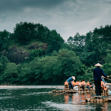 九曲溪竹筏漂流一般是从九曲到一曲顺流而下,这样随波逐流,更加轻快、迅疾。游九曲,所乘之舟为8-9根去皮毛竹烤后扎成。吃水浅、浮力大,游人乘坐安稳舒适,视野开阔,可见山景,能赏水色,顺九曲溪漂流而下既轻松惬意,又有惊无险。